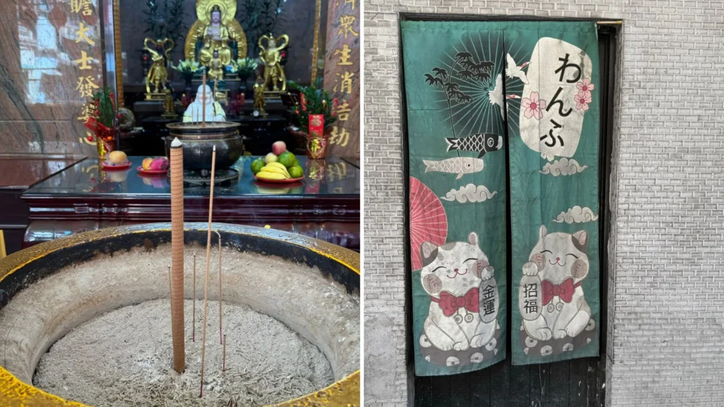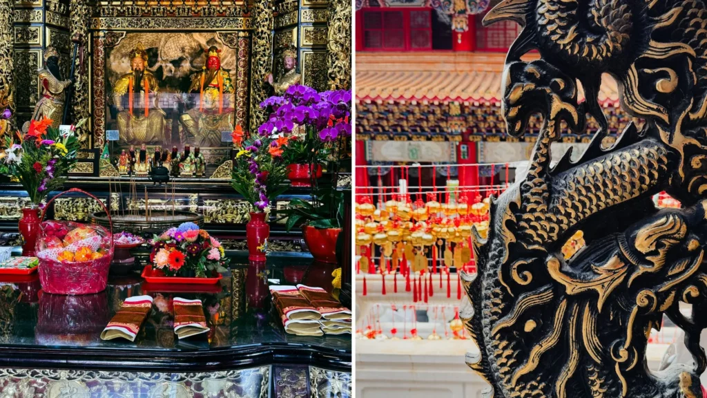 Se tutto è in movimento come la stessa evoluzione del paese, la calma e il silenzio è ciò che troverete entrando nei vari templi. Un silenzio “sacro” di preghiera ammorbidito da dense nuvole d’incenso che celebrano il culto degli antenati. Un spazio sospeso interrotto solo dal rumore sordo dei gong, ma anche di “qualcosa” che a ritmo regolare cade a terra.