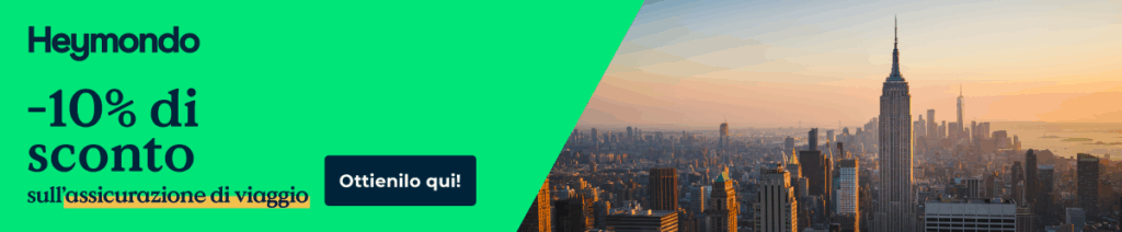 Assicurati un viaggio sicuro ovunque tu vada. Io uso per ogni mio viaggio l’assicurazione Heymondo: facile, veloce, chiara ed ottimo rapporto qualità-prezzo! Clicca qui avrai uno sconto del 10%!